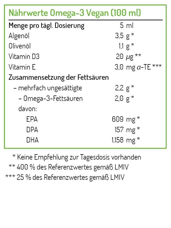 Das Omega-3 Vegan enthält ein rein pflanzliches Algenöl. Grundlage des Öls bildet die Mikroalge Schizochytrium sp. Sie wird in großen Behältern in künstlichem Meerwasser kultiviert. Diese Alge ist besonders reich an den marinen Omega-3-Fettsäuren, DHA und EPA, und deshalb optimal geeignet für die Weiterverarbeitung zum Omega-3 Vegan Öl. Die Produktion des Öls erfolgt nachhaltig und umweltschonend.
